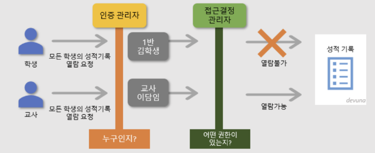 - 인증된 사용자가 요청된 자원에 접근가능한가를 결정하는 절차이다.